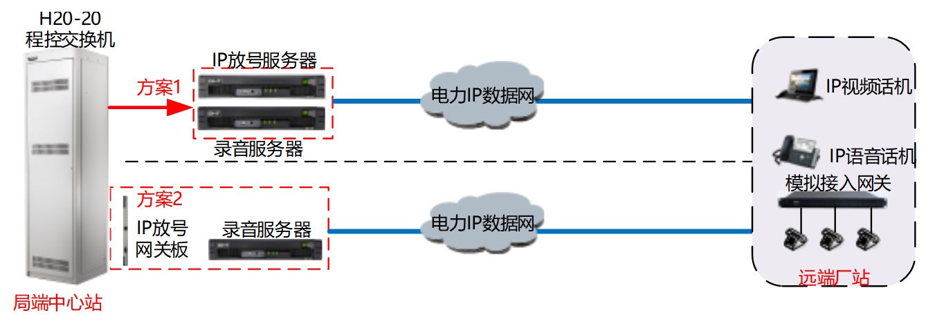 廣哈通信的IP放號解決方案主要有兩種方式,一種是通過部署IP放號服務器進行放號,另外一種直接在H20-20程控交換機上接入內置IP放號網關板,從而實現遠端站點的放號。